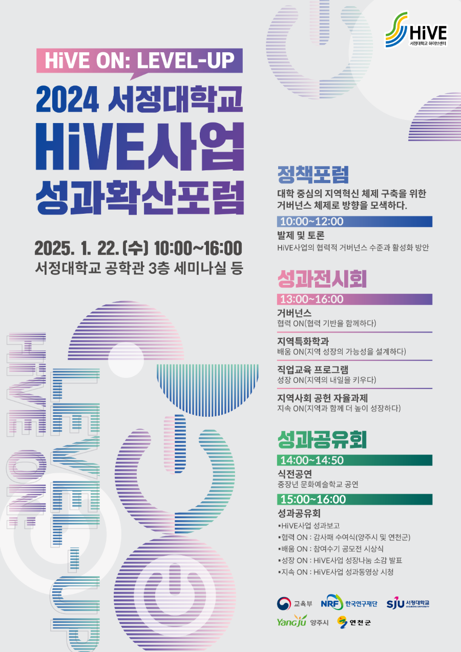 3년간 진행된 HiVE사업의 성과물을 전시하고 주요 성과를 공유하는 성과전시회 및 공유회가 진행됩니다. 또한, <대학중심의 지역혁신체제 구축을 위한 거버넌스 체제로의 방향을 모색하다>를 주제로 SJ HiVE 이슈&진단 정책포럼도 개최될 예정이오니 많은 관심과 참석 부탁드립니다. 감사합니다.