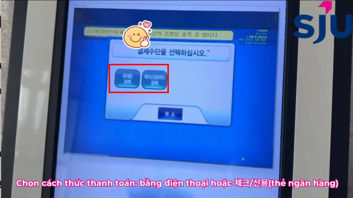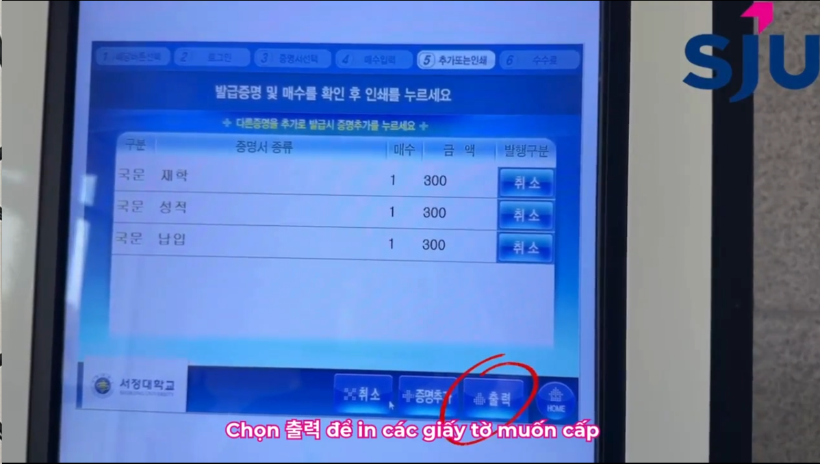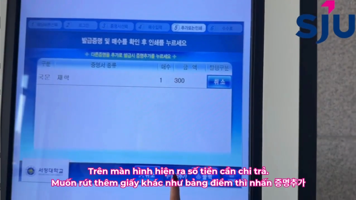 *Trên màn hình hiện ra số tiền cần chi trả. Muốn rút thêm giấy khác như bảng điểm thì nhấn 증명추가