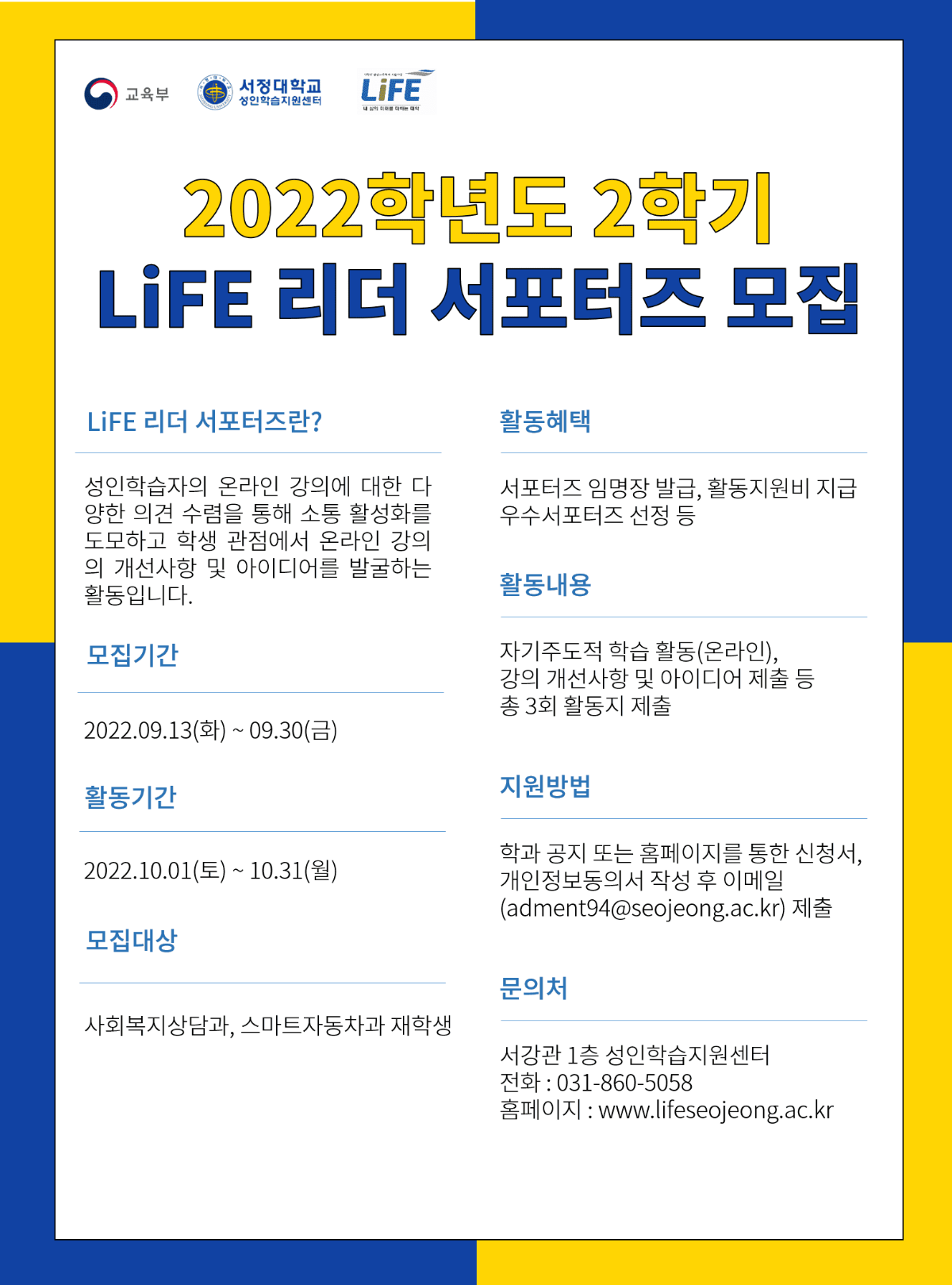 2022학년도 2학기 LiFE리더 서포터즈 모집 신청서 제출기한