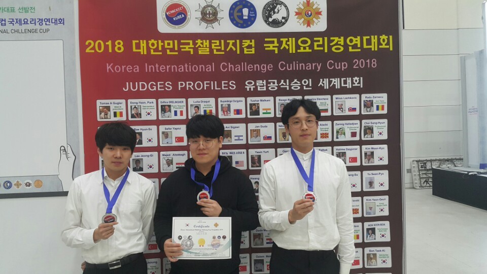2018년 5월 12일 대전 컨벤션센터에서 개최된 2018년 대한민국 챌린저컵 바리스타 챔피언쉽대회에서 항공관광과 1,2 학년 학우들이 단체전에 출전하여 금메달(박현석, 최원준, 최정훈)을 획득하였습니다. 평소 학교에서 커피바리스타에 대한 이론과 실습위주 수업과 동아리활동을 통해 연마한 학생들의 실력과 자신감을 확인하는 계기가 되었습니다. |