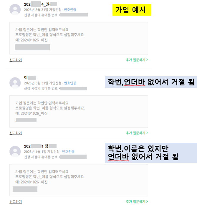 또한, 기존에 가입이 거절된 학생들은 프로필명이 형식에 맞지 않아 거절된 경우이니, 다시 신청하실 때 반드시 확인 후 신청해주시기 바랍니다.